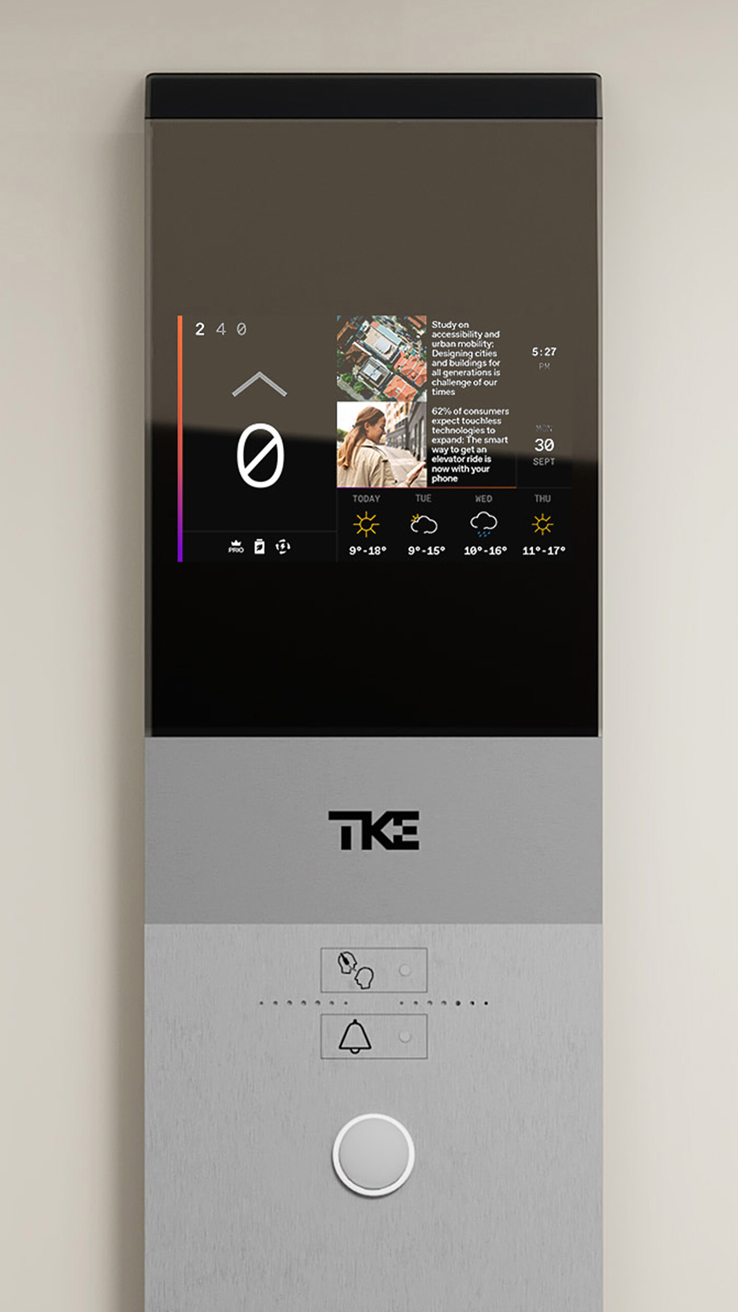 Regenerative driveEvery EOX recuperates electricity from braking and feeds it back into the building for other electricity consumers to use. Multimedia displayThe standard in-cabin screen is a 10″ TFT, enriching the travel experience with animation and infotainment features. Eco-modeThe elevator adjusts to the traffic patterns of the building and lowers its acceleration during off-peak hours. “Swipe a ride”Passengers can call an elevator ride on their smartphone* as an alternative to the button-operated panels. |