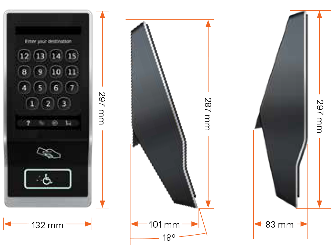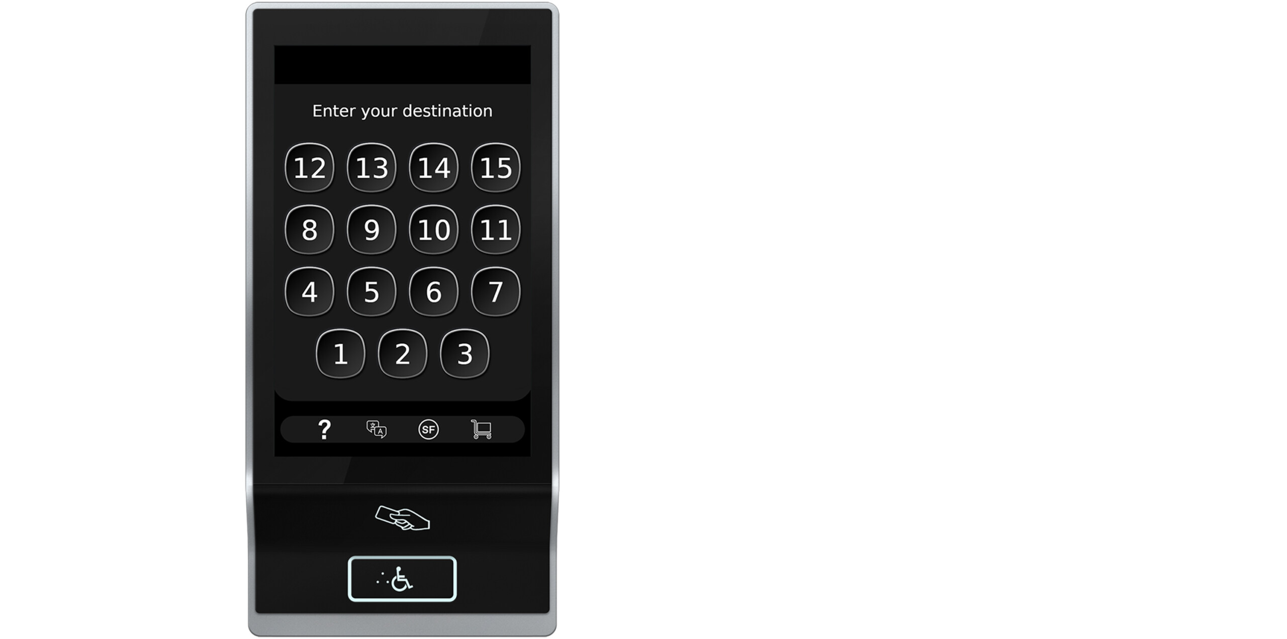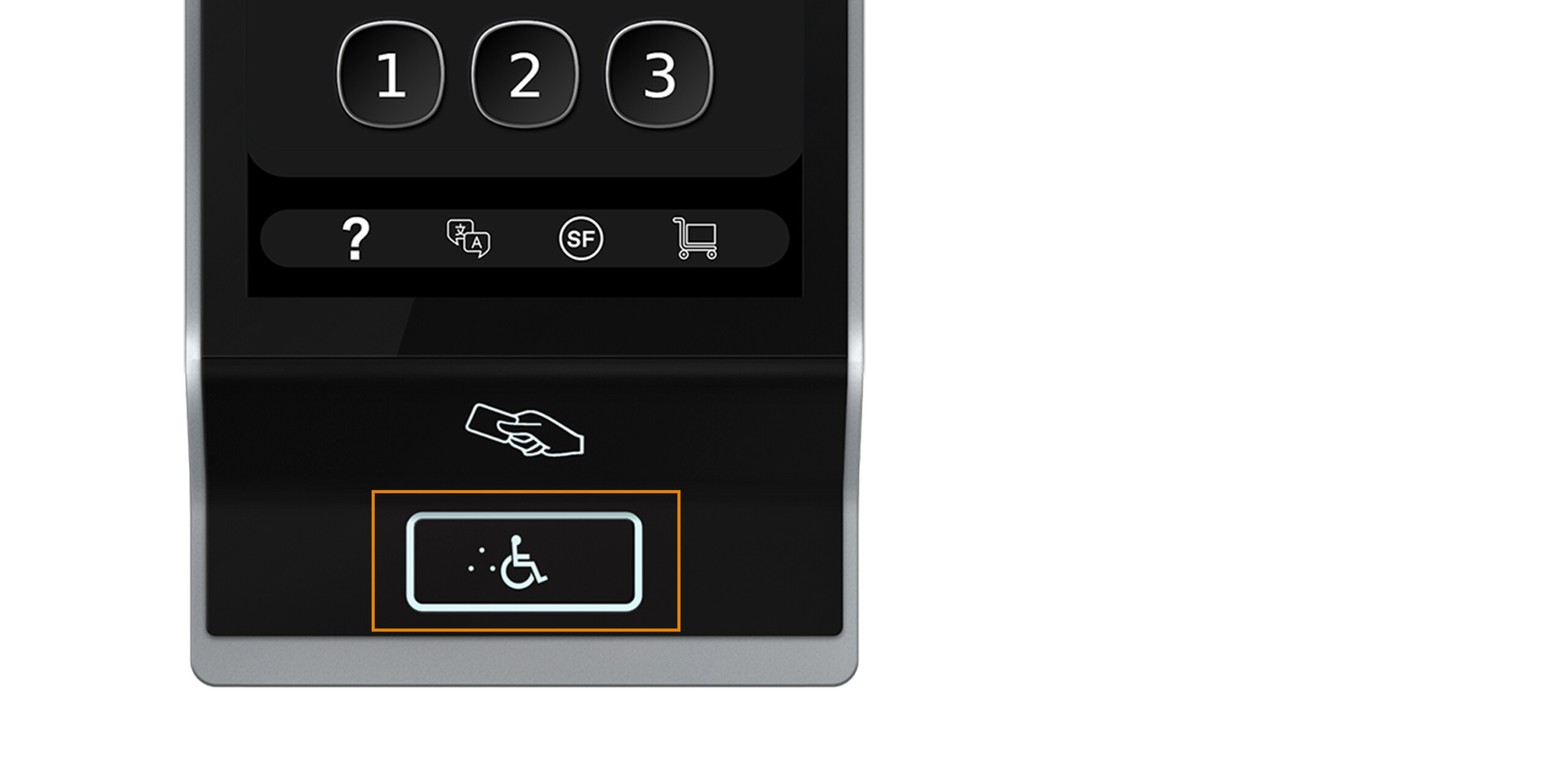 Hardware button to support passengers with disabilities with audio guidance and extending walking and door dwell times. When the accessibility button is operated, the floor numbers are listed audibly in ascending order via the built-in loudspeaker. As soon as the desired destination floor has been announced, the accessibility button must be pressed again. This confirms that floor as the destination floor. The elevator selected by the system is then announced. Complies with EN 81-70.