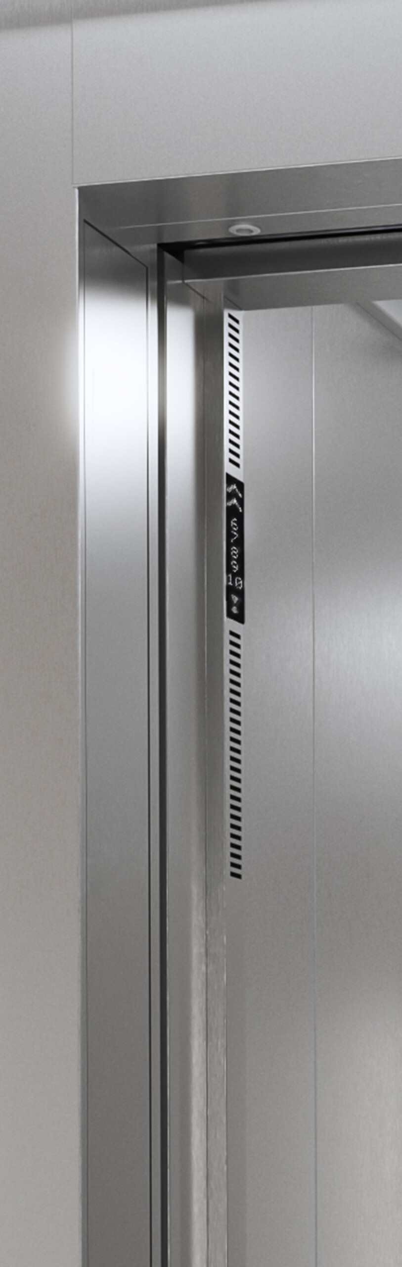 The optional Next Level Indicator is a slim monochrome matrix LED display embedded in the cabin door frame showing the next stops assigned to the elevator. It aids passenger comfort and facilitates orientation, both inside the elevator cabin and at the landing.