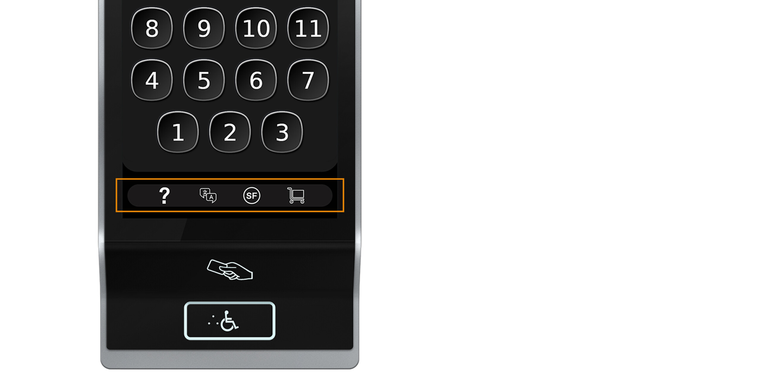 The dock section hosts buttons for additional functions such as the help (?) and language section for passenger assistance.