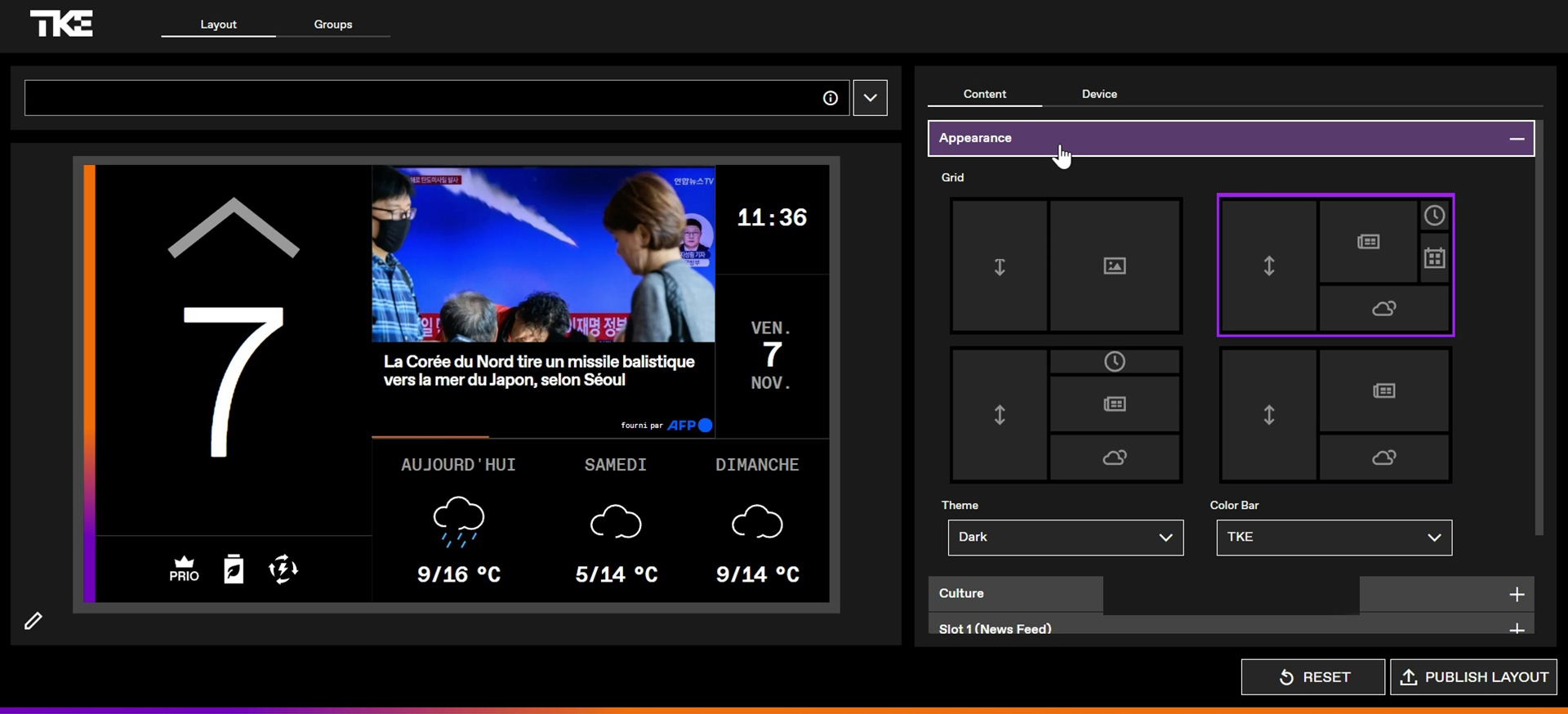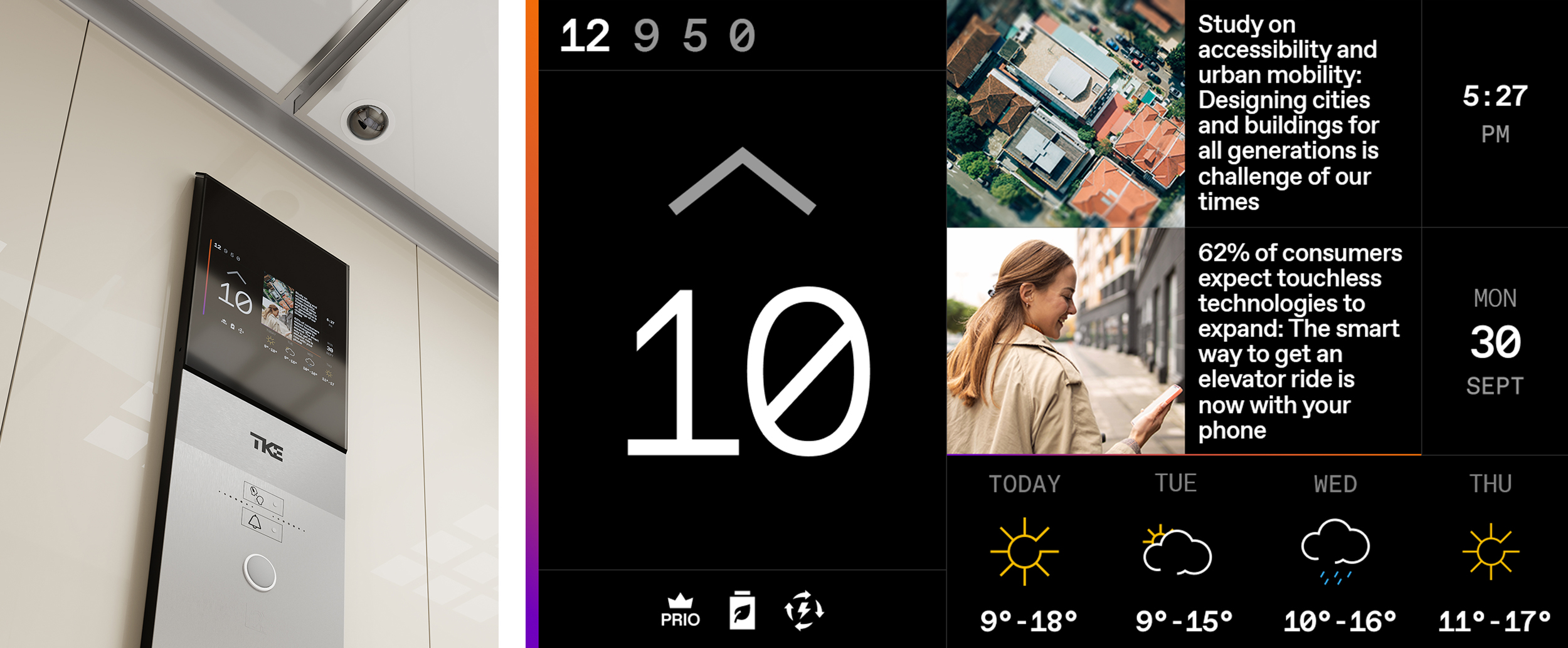 AGILE Infotainment Advanced unlocks customisation flexibility for your EOX in-cabin multimedia display. Choose from an extended range of layouts, post building messages for tenants and visitors, upload your own media, schedule content publication, and configure your own news widget categories (e.g. lifestyle, sports). Contact your TKE representative to check availability and functional scope in your region.